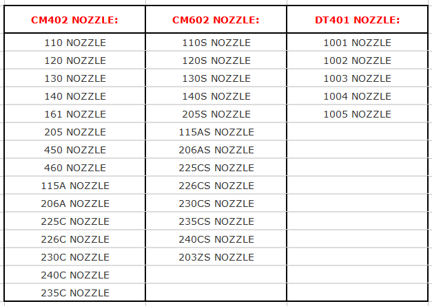 Nozzle 110S 115AS 120S 130S 140S 205S 206AS 225CS 226CS 230CS